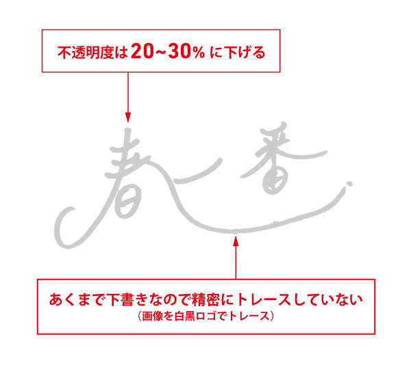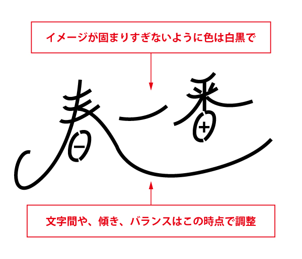 滑らかな線なのでペンツールでなぞっていきます。このときに気をつけていることは色を最初から付けずに白黒で描いていくことです。また、文字のバランスの調整も違和感があればここで行います。