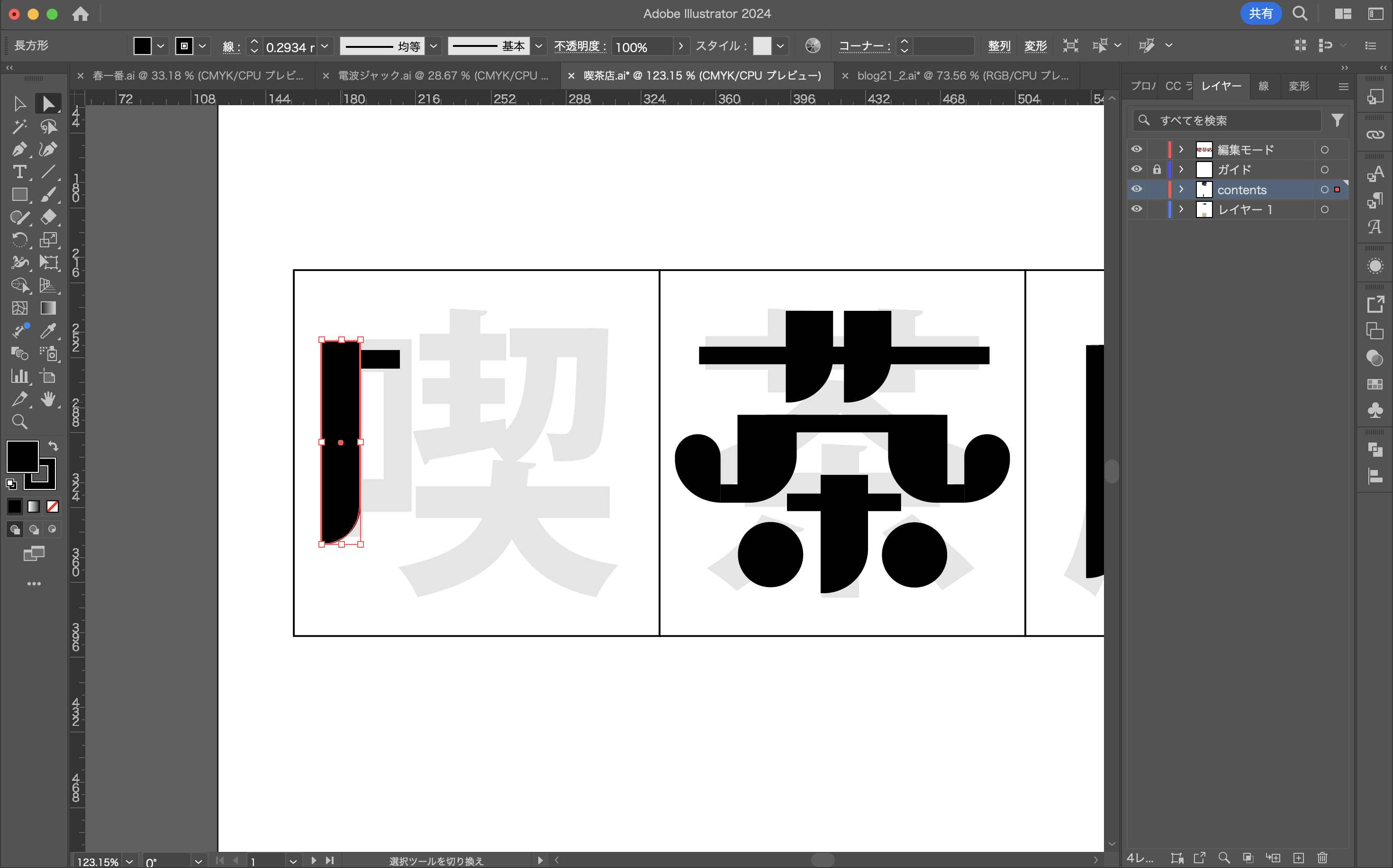この解説動画のように、変形させた長方形と円を組み合わせながら1つ1つのエレメントを作っていくことで今回のテーマである喫茶店にも応用させた例になります。文字サイズのバランスをとるためには、1文字ごとに枠をつけることと、下書きのようにして文字を置いてトレースすることがポイントかなと思いました。