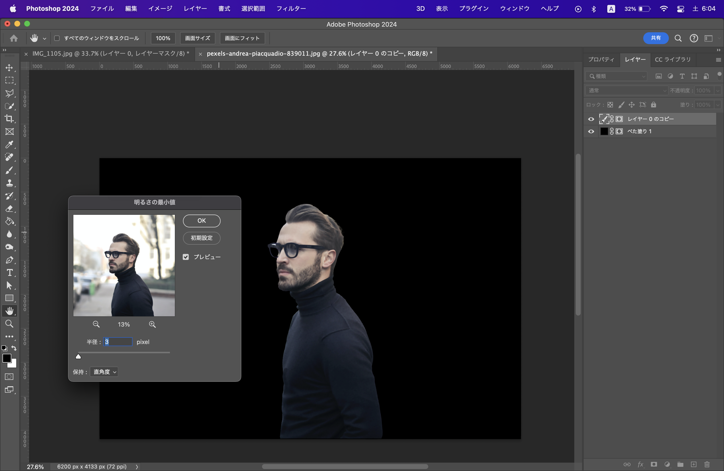 まずは男性を選択しレイヤーマスクをかけます。分かりやすいように背景は黒とします。